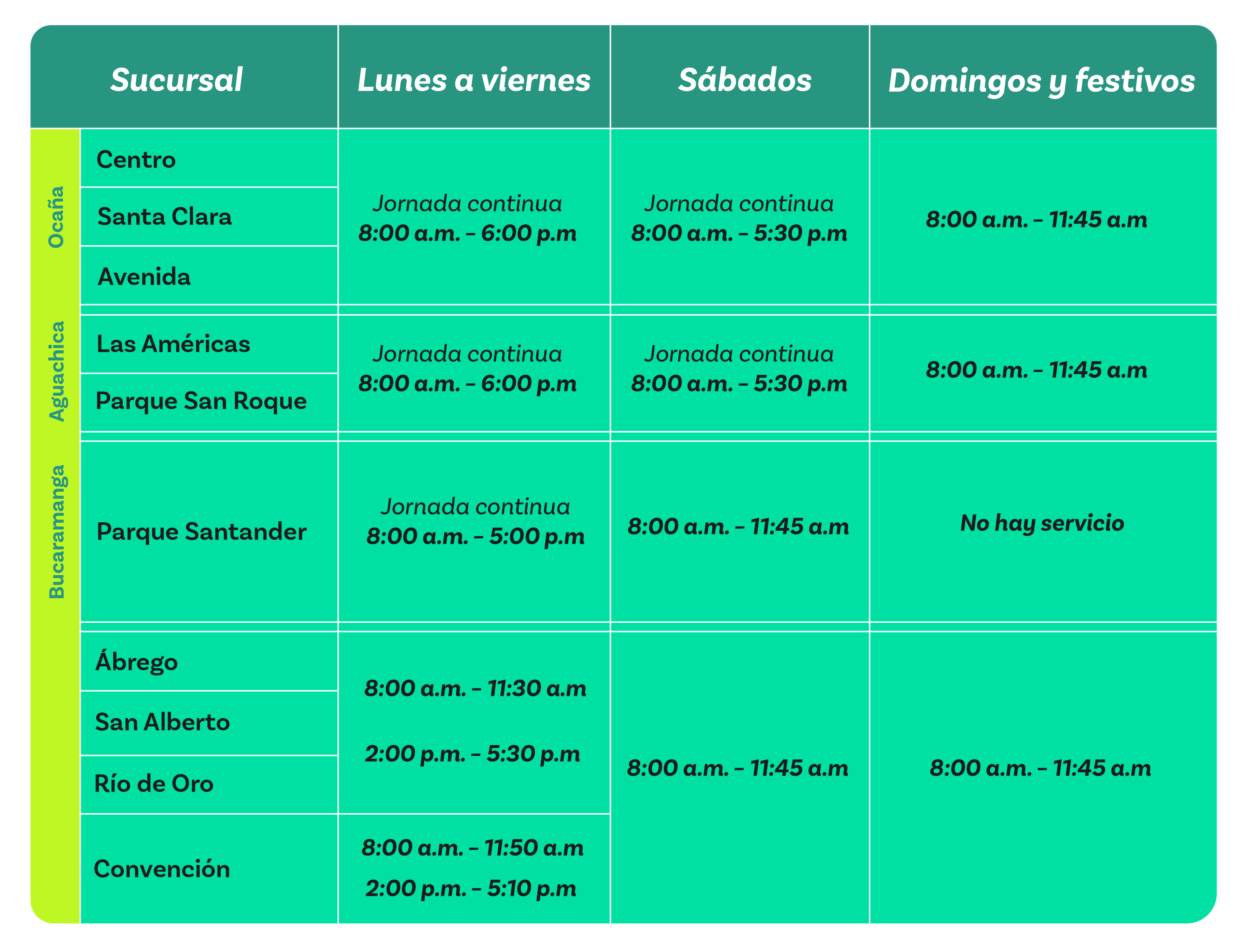 La Supersolidaria como ente de supervisión y control de Crediservir establece un horario básico mínimo de atención al público de 28 horas hábiles semanales entre las 8:00 am y 6:00 pm, la cooperativa para facilitarle a los asociados el acceso a los diferentes servicios, tiene un horario en jornada continua en las Sucursales Centro, Santa Clara, Avenida, Las Américas, Parque San Roque y Parque Santander, así: